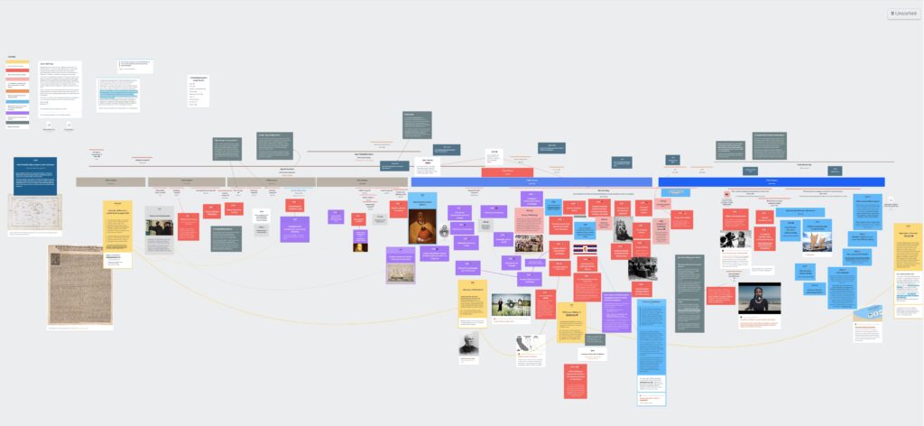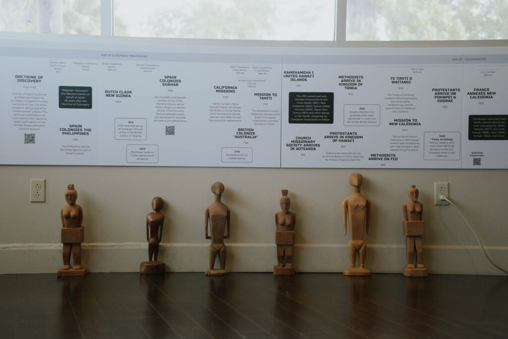 The linear print edition of Mapping Pasifika Histories tracks movement from the 16th through 19th centuries and is currently on view at the Pacific Island Ethnic Art Museum in Long Beach, California. At 12 ft long by 2 ft high, features audio segments that dive deeper into the Doctrine of Discovery, the 1898 Treaty of Paris, a protocol for learning together, and how to approach historical research as a Pacific person.